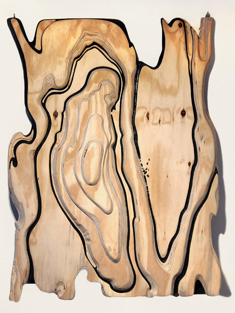 Détours, 2022, médiums mixtes et bas-relief sur contreplaqué, 48 x 36 x 1 1⁄2”