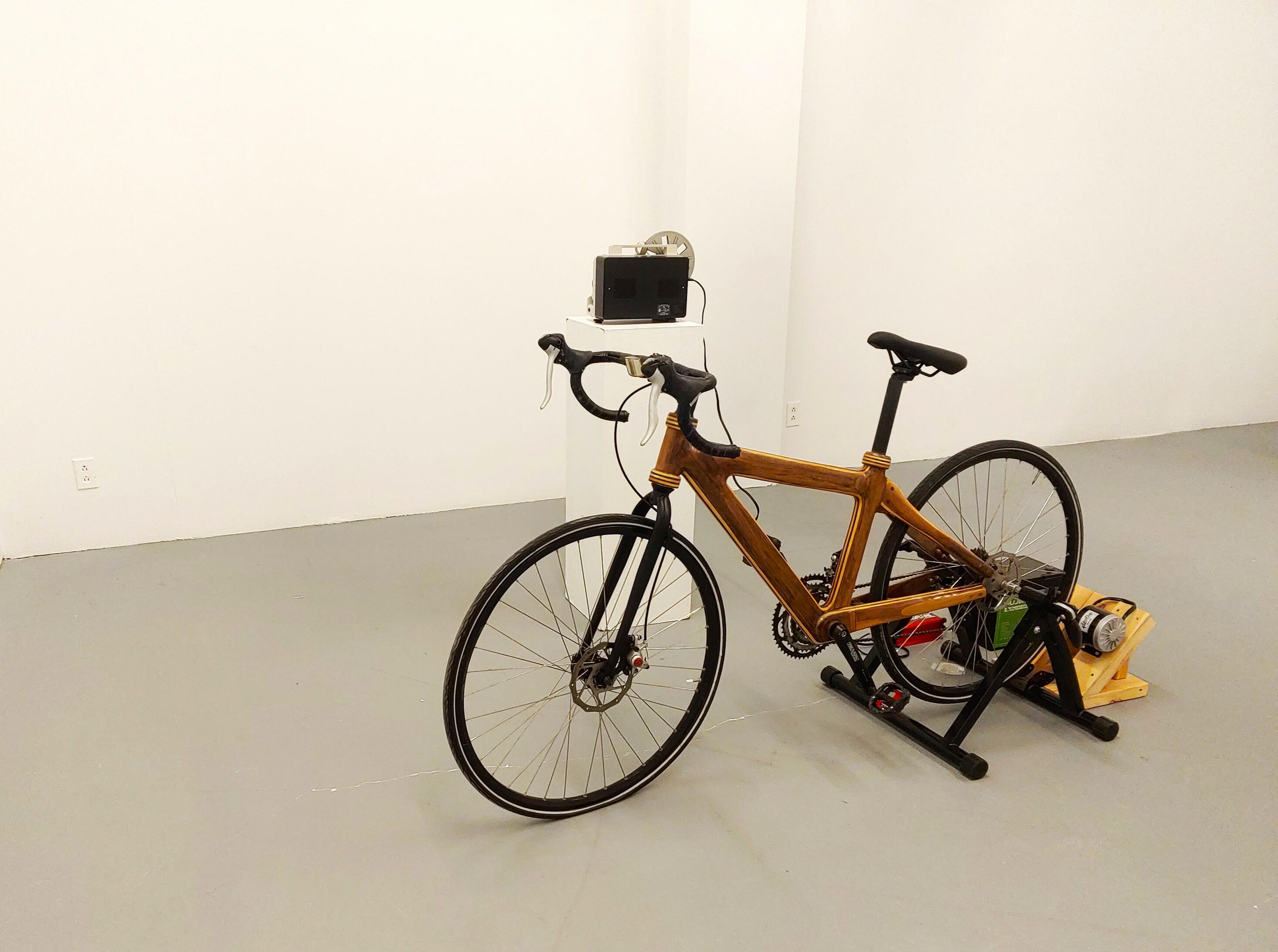 Garder le rythme (projet en cours), 2026, installation, vélo en frêne et noyer, moteur générateur, batterie, convertisseur, composantes électriques, projecteur analogiqueUn vélo en bois accumule lentement l’énergie nécessaire pour faire apparaître une image. La projection Super 8 ne se manifeste qu’après un temps d’effort et d’attente. Mouvement, matière et projection se rencontrent pour créer un moment de suspension, où l’image émerge dans la durée et l’attention.